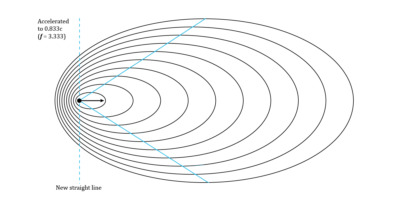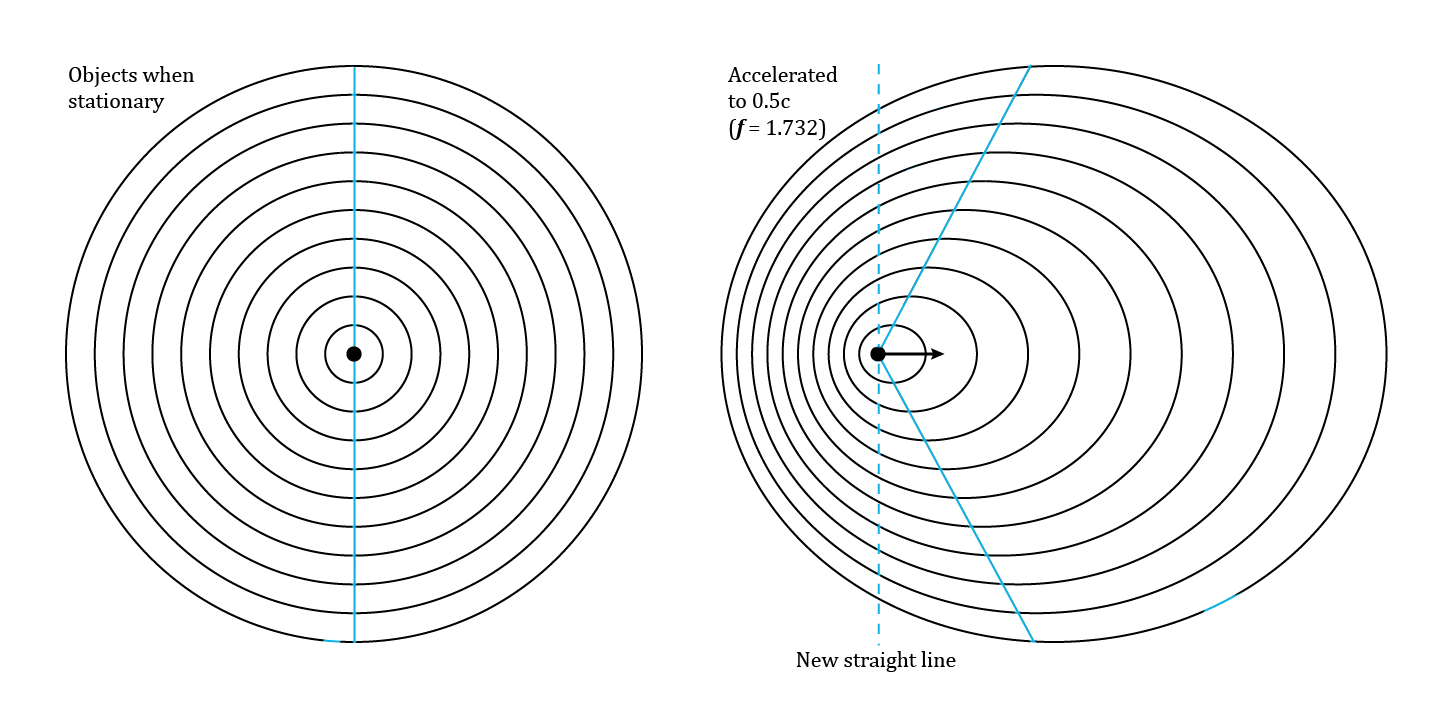 As previously described, an observer's perception of a straight line is tilted backward when the observer is speeding up and looking sideways. Objects appear to be farther away when the observer is looking forward and closer when he or she is looking backward. The optical effect of this geometrical transformation can be equated to changing the focal length of a camera lens. This effect is very similar to the optical appearance effect that manifests when the observer is changing velocity. The primary difference is that the optical appearance effect is not simply a visual effect; it is an effect on the actual geometry to which one has adapted oneself when one changes velocity.