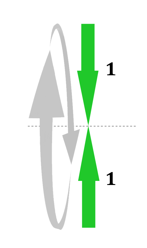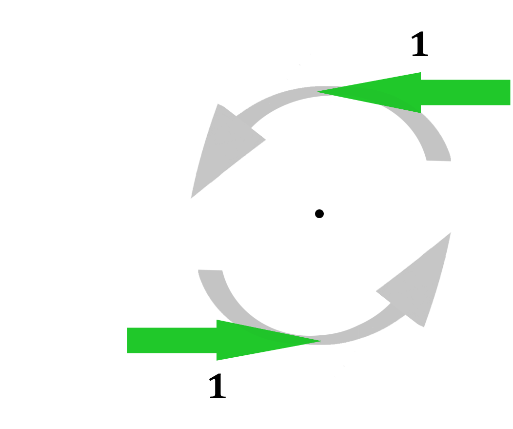 Now, let us examine two momenta rotating around the z-axis. Both have a magnitude of 1 in any arbitrary unit, and the compound as a whole has thus an internal energy (mass) of Eint= 2. The momenta have a continuous exchange of momentum, meaning their sum in momentum always is 0.