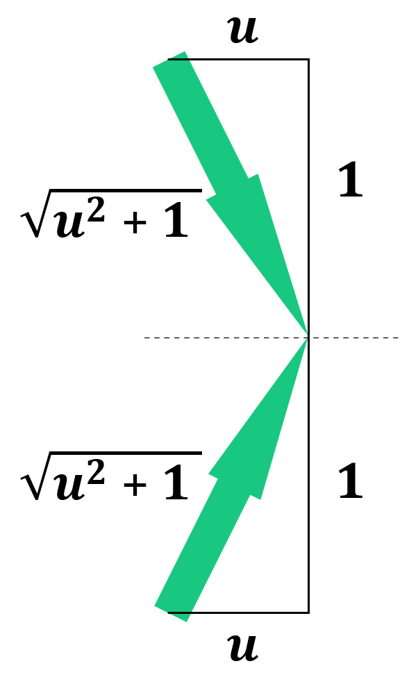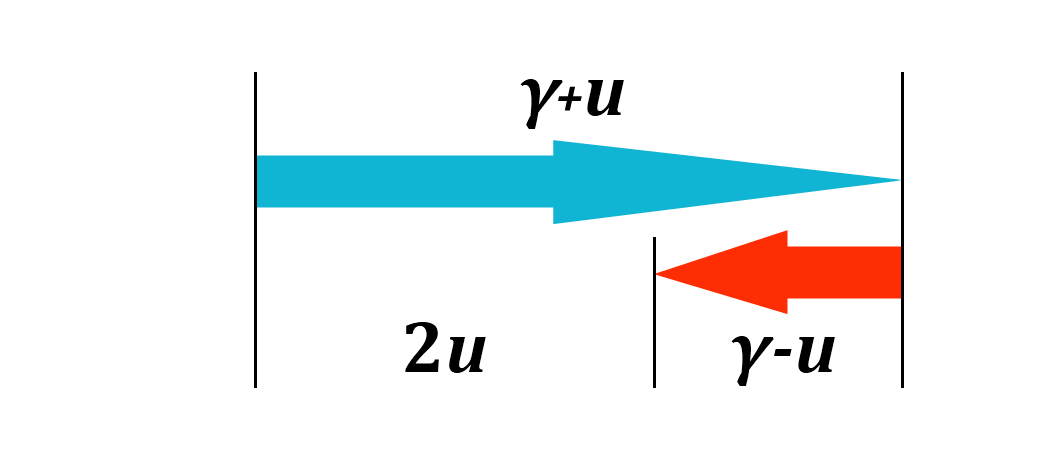 If we now want to accelerate this compound to the right, the IGS transformation tells us that the momentum vectors should be transformed by x' = γx - ur. In this particular case, x1= 1, x2= -1 and r = 1, which means that x1' = γ - u and x2' = -γ - u. The length of the second momentum vector is thus | -γ-u |= γ + u.