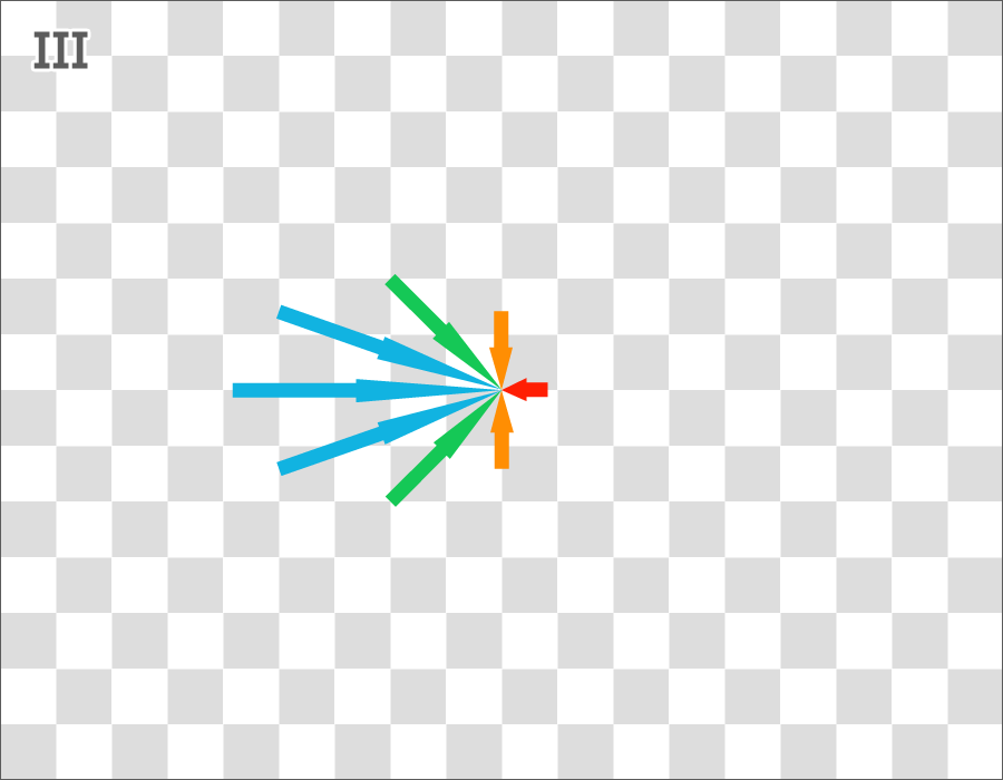 Momentum: If we use vector addition for all momenta in III, it will produce a result of 8 to the right. This is the total momentum arising from the formula P = Eint u, where Eint = 8 and u = 1.